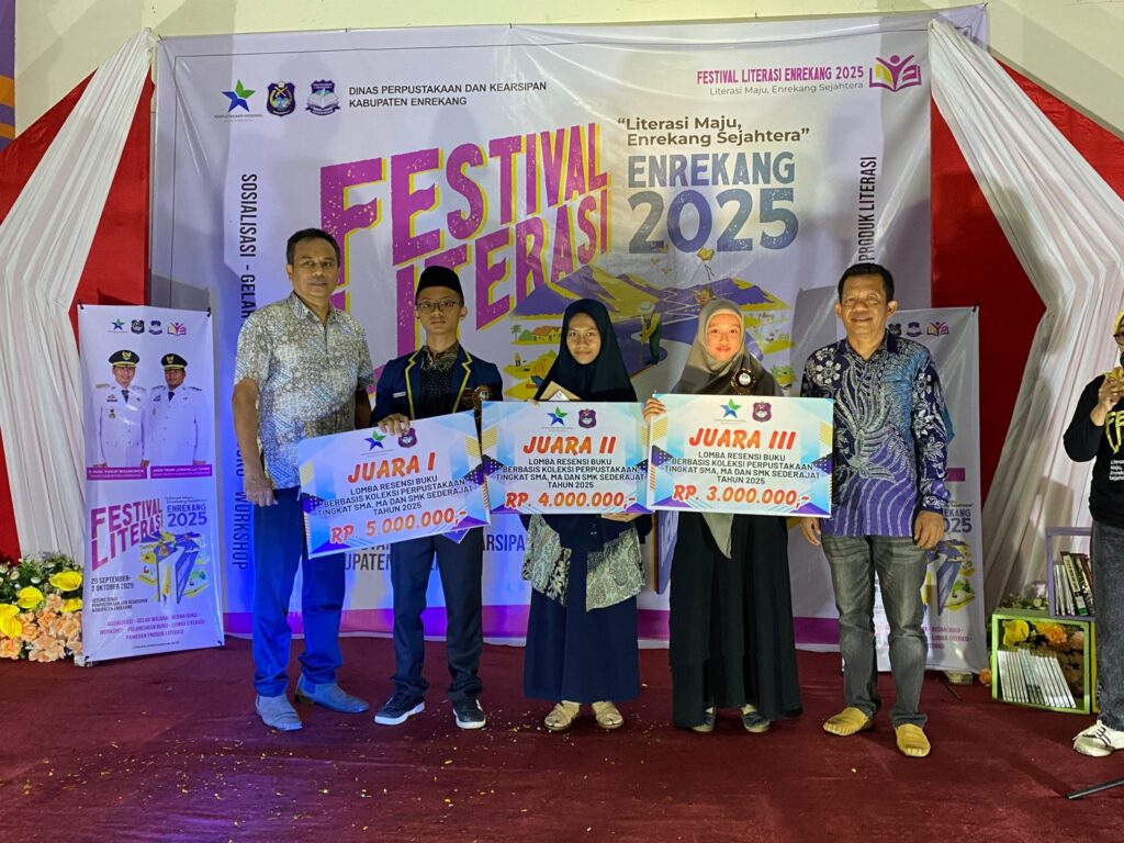 Pengumuman pemenang dilanjutkan dengan penganugerahan dalam agenda Penutupan Festival Literasi 2025, yang bertajuk “Literasi Maju Enrekang Sejahtera,” pada Kamis, 2 Oktober 2025 di Dinas Perpustakaan dan Kearsipan Enrekang. Para pemenang menerima Anugerah Literasi 2025, diserahkan langsung oleh Pejabat Dispustaka Enrekang dan didampingi Kepala Sekolah. Lomba Resensi Buku Koleksi Perpustakaan ini merupakan agenda nasional yang bertujuan untuk meningkatkan minat baca dan kemampuan literasi generasi muda, serta mendorong pemanfaatan koleksi perpustakaan.